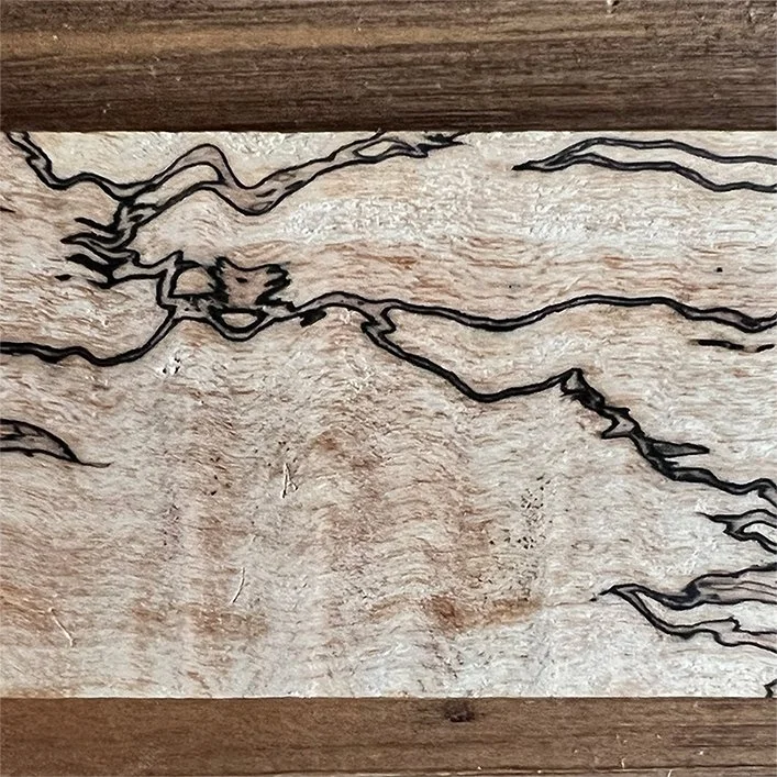 Character markings: The range of character marks in spalted maple is highly variable. It will contain a balanced spalt lining, tight knots, fine cracks, bark inclusions, random tap holes, discoloration from maple sugaring hardware, impact from insects, and many other characteristics imparted by its long life in the natural world.